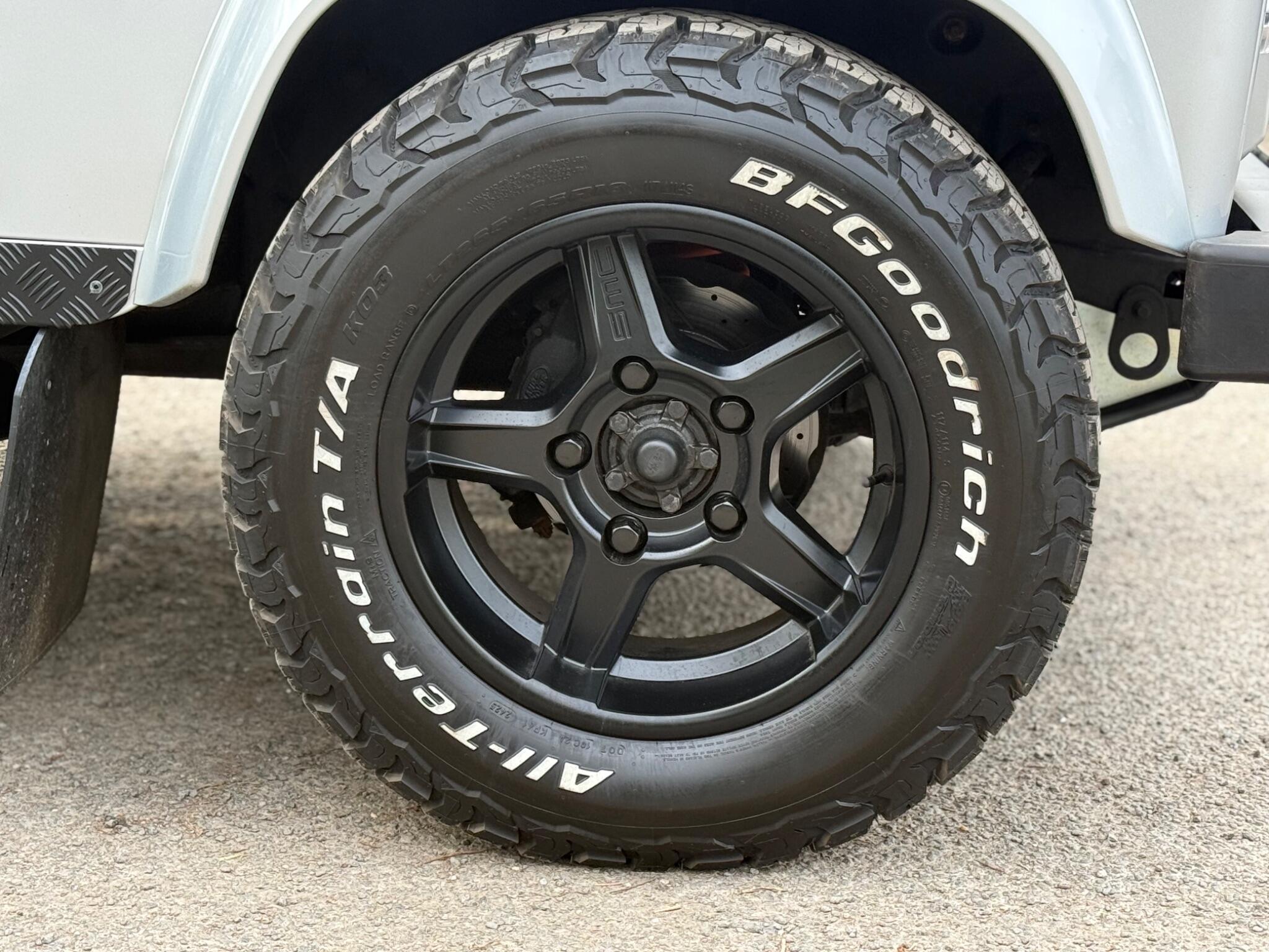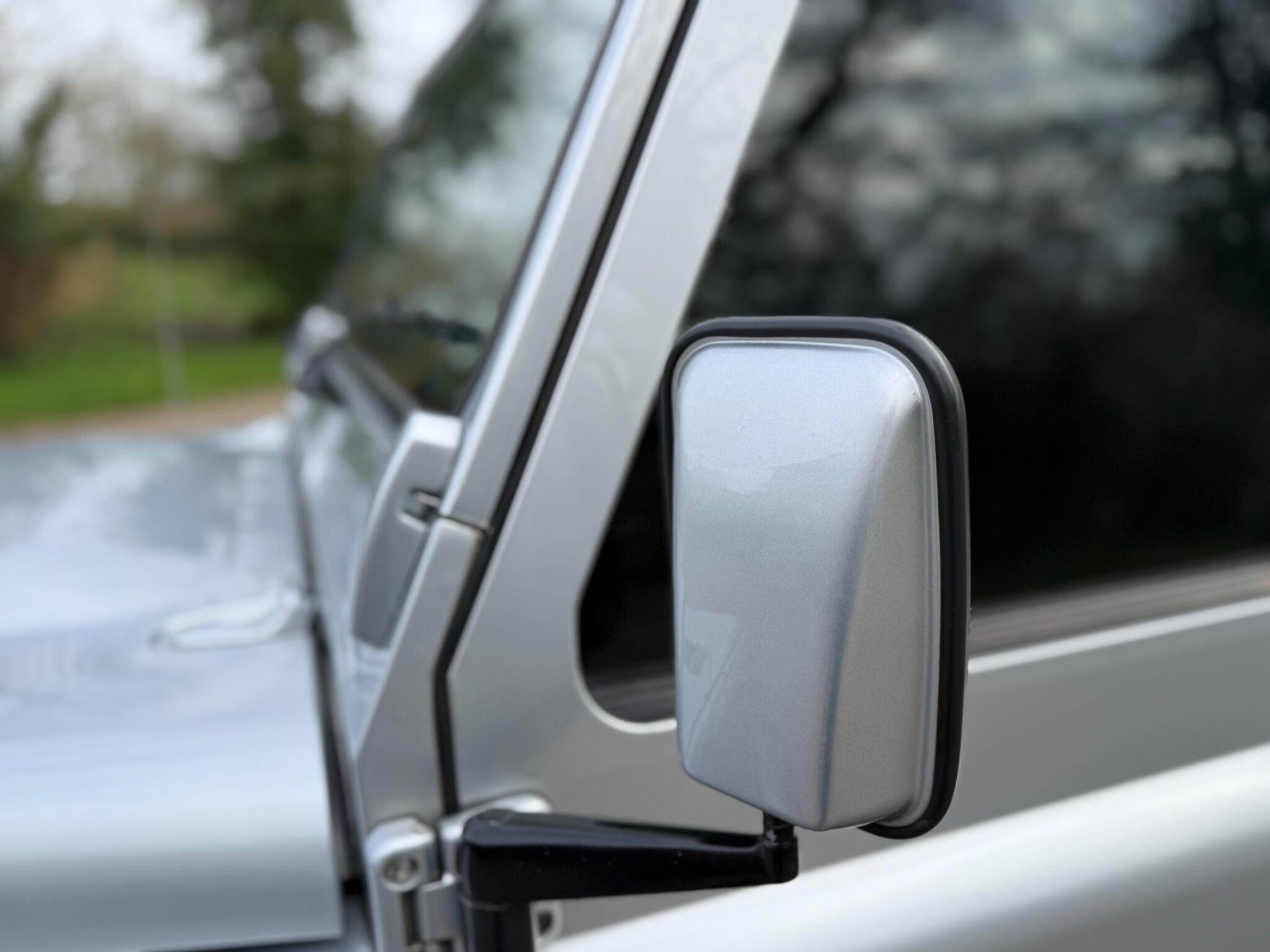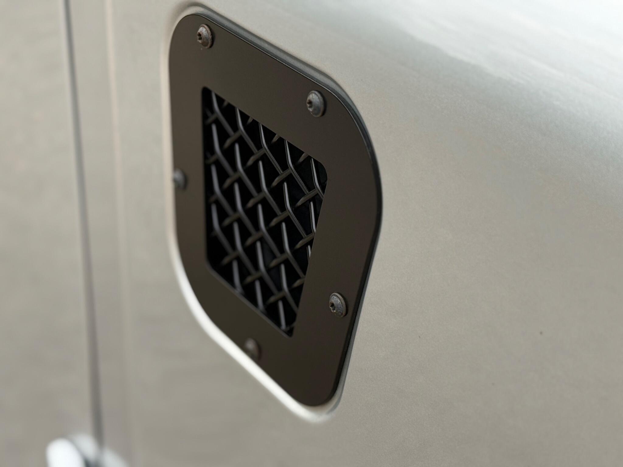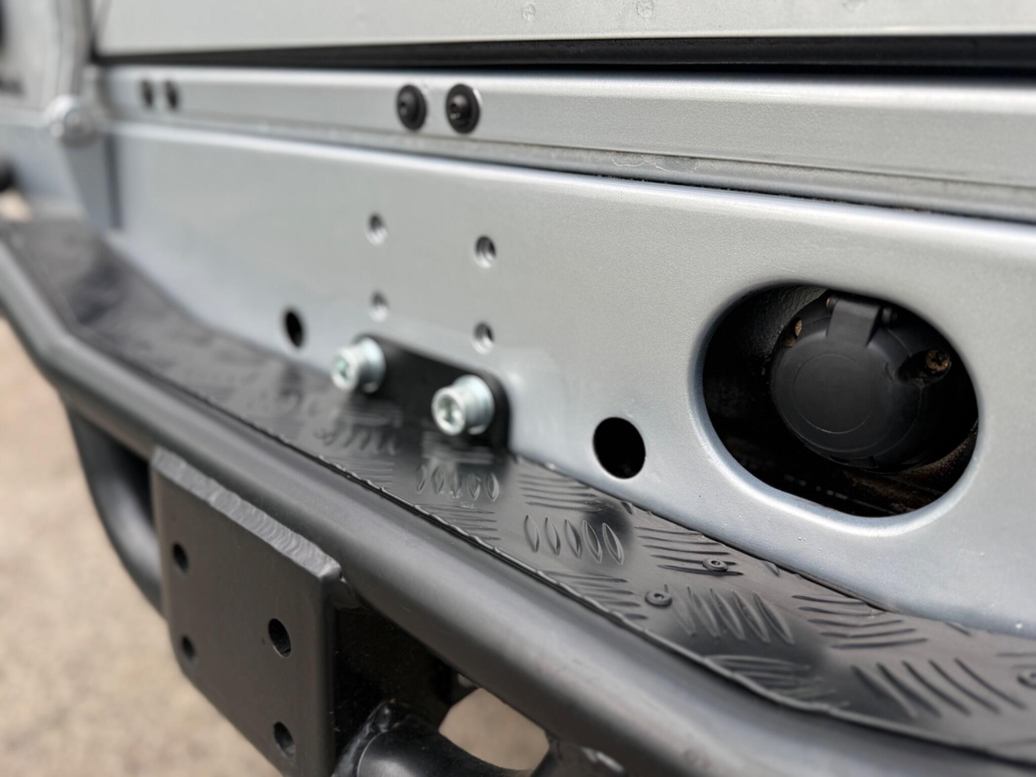 Heritage front grille with matching headlight surrounds, Heritage wing-top and side vents, LED headlights, zinc-coated front bumper with integrated LED DRLs, steering guard, premium chequer plate to side sills and rear quarters, rear crossmember finished in body colour, full-width rear NAS step, gloss black side steps, colour-coded mirrors, stainless exterior bolt kit, stainless tailgate hinges and privacy glass.